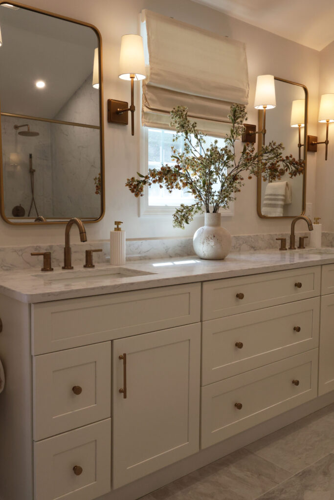 This bathroom was designed with a soothing palette and refined finishes that create a sense of calm. The custom double vanity, painted in a soft neutral tone, is topped with marble-look quartz countertops that bring both luxury and durability. Warm brass fixtures and hardware add a touch of sophistication, complemented by elegant wall sconces that frame the mirrors with soft, flattering light.